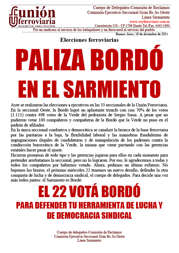 Ayer se realizaron las elecciones a ejecutivos en las 33 seccionales de la Unión Ferroviaria. En la seccional Oeste, la Bordó logró un aplastante triunfo con casi 70% de los votos (1.111) contra 498 votos de la Verde del pedracista de Sergio Sasia. A pesar que no pudieron votar 100 compañeros y compañeras de la Bordó que la Verde no puso en el padrón de afiliados.