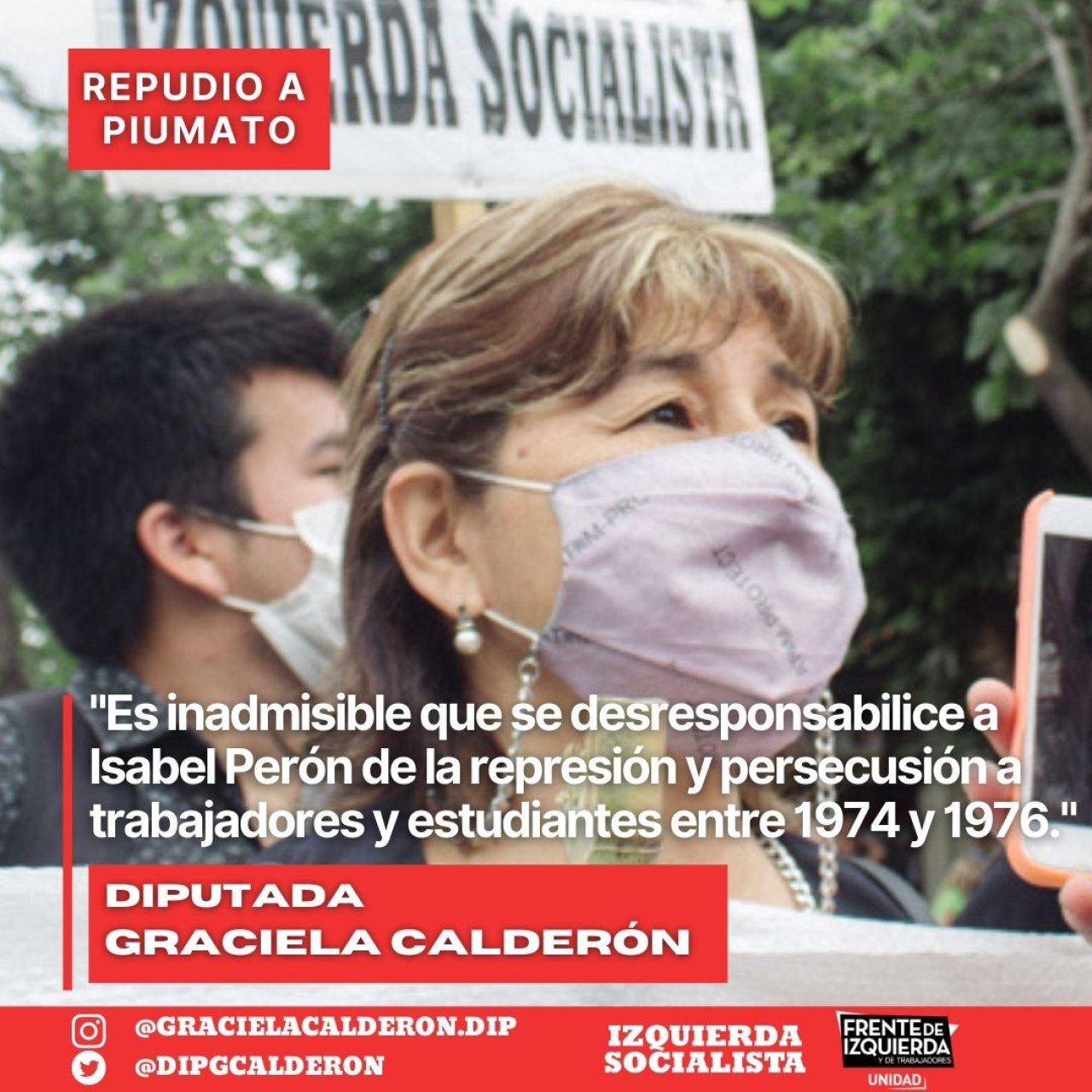 La diputada Graciela Calderón presentó, desde la banca de Izquierda Socialista en el Frente de Izquierda Unidad, un proyecto en repudio al secretario de Derechos Humanos de la CGT, Julio Piumato, que sostuvo públicamente que se deberían dejar sin efecto las acusaciones y juicios contra Isabel Perón, vinculadas a la represión y persecución de trabajadores y estudiantes en el período que gobernó, luego del fallecimiento de Perón.