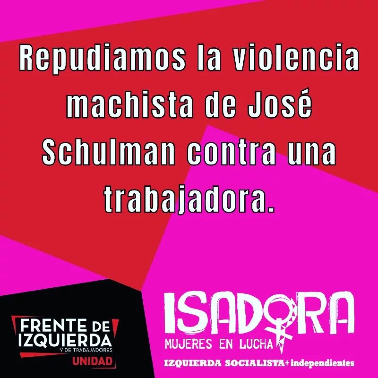 Nos solidarizamos con la trabajadora y exigimos justicia frente a este inaceptable hecho de violencia machista por parte de Schulman, más aún viniendo de alguien que se dice “defensor de los derechos humanos” o “de izquierda”, lo cual demuestra que nada tiene que ver con ello. Schulman es parte de una falsa izquierda (el Partido Comunista) que integra el gobierno peronista del Frente de Todos, gobierno que no defiende los derechos de las trabajadoras y acaba de pactar con el FMI.