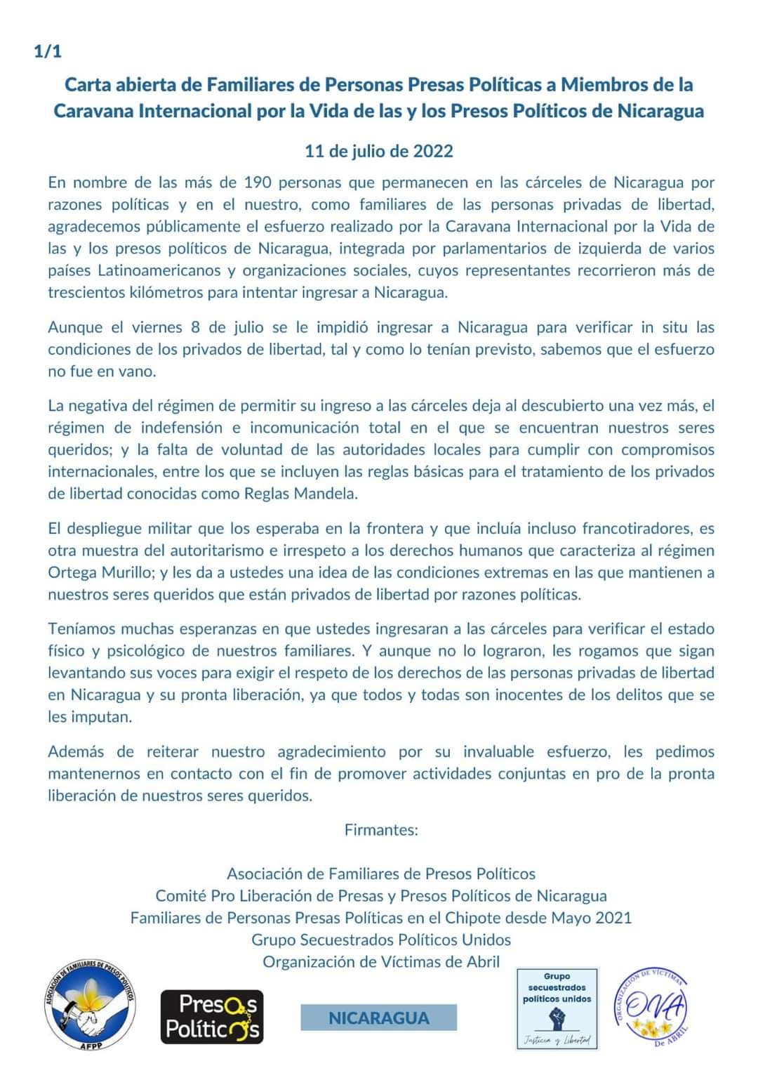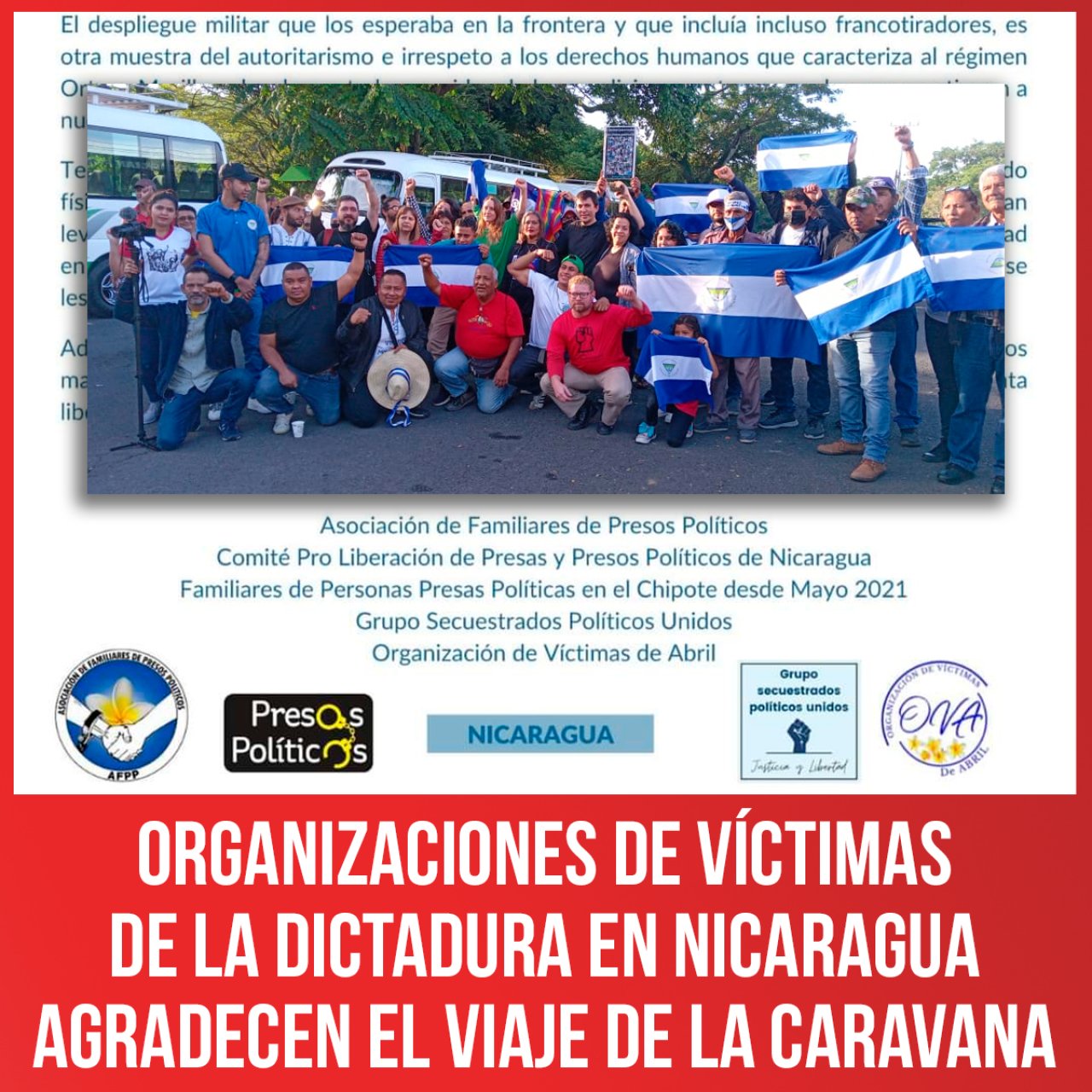 Organizaciones de Derechos Humanos, de familiares y por la liberación de los presos políticos de la dictadura de Ortega-Murillo en Nicaragua publicaron un agradecimiento al viaje realizado por la Caravana Internacional por la Vida de las y los presos políticos de ese país.