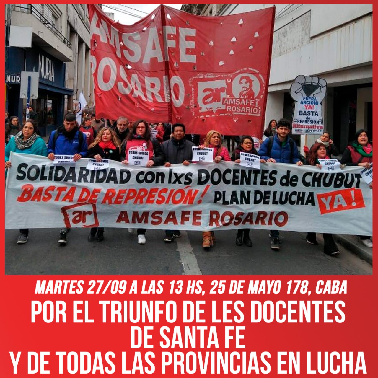 Ratificando los tres días de paros planteados por AMSAFE, sindicato docente de Santa FE ante el descontento de la oferta salarial del gobierno provincial de Perotti y la amenaza de los descuentos que arrojó el resultado de un importante rechazo. El descontento sigue recorriendo todas las escuelas y se ratifican los paros ya votados para el 27/28 y 29/9 con acciones como Asamblea de Aceiterxs en apoyo a la huelga docente, Asamblea por escuelas junto a las familias y movilización provincial el día jueves 29/9.