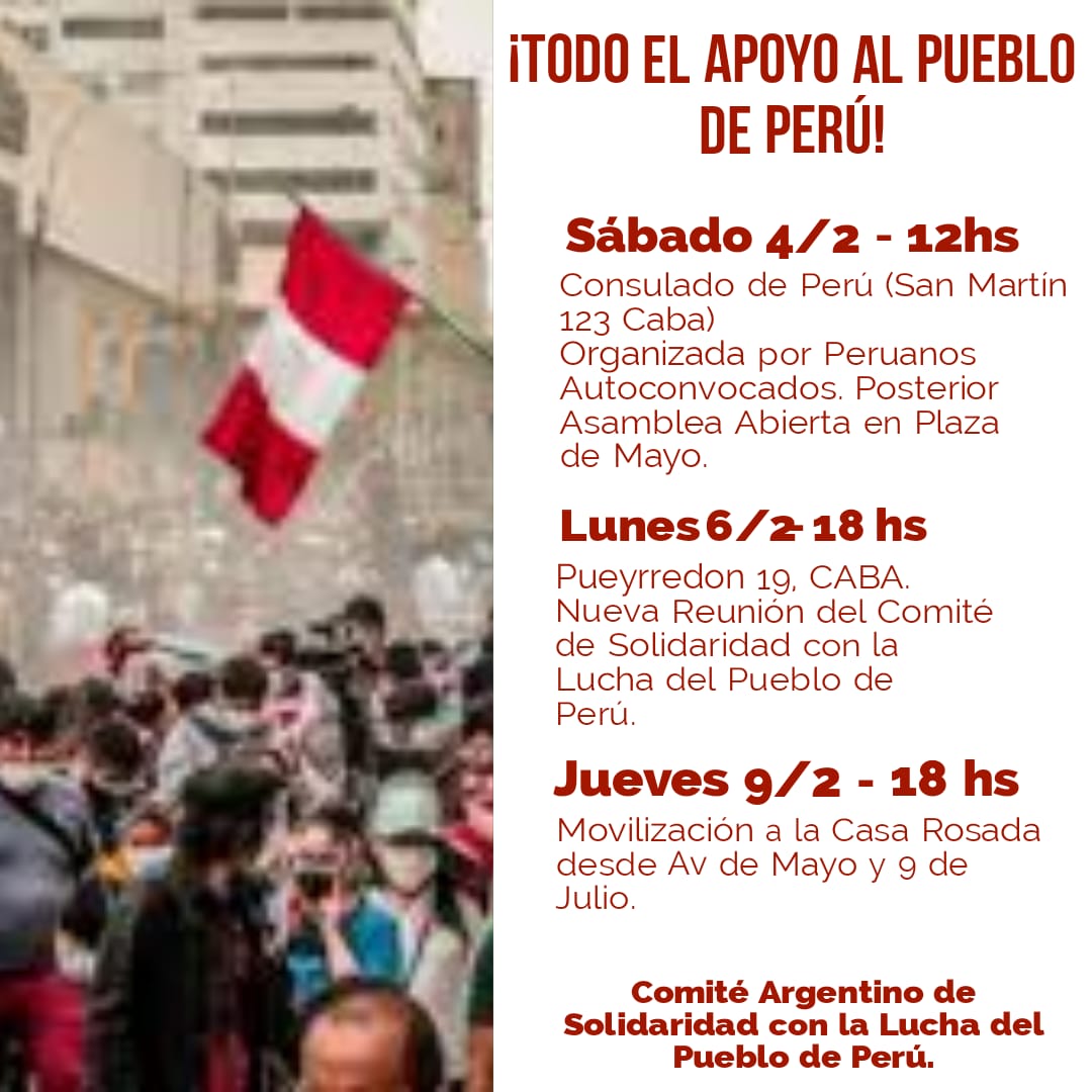 Se resolvió impulsar una gran movilización unitaria el día 9 de febrero a las 18 horas desde Av de Mayo y 9 de Julio a la Casa Rosada, en coincidencia con las movilizaciones que ese día se harán en Perú, para reclamarle al gobierno argentino que rompa relaciones con el gobierno usurpador de Dina Boluarte.