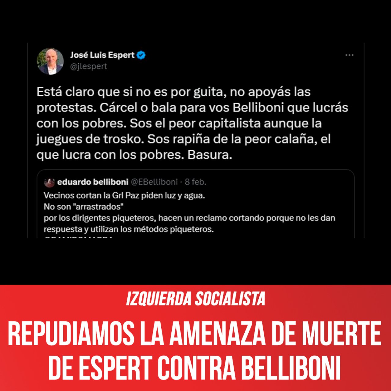Desde Izquierda Socialista / FIT Unidad repudiamos la amenaza de muerte que José Luis Espert, referente de los liberfachos de Avanza Libertad, realizó contra el dirigente del Polo Obrero y del Partido Obrero, Eduardo Belliboni.