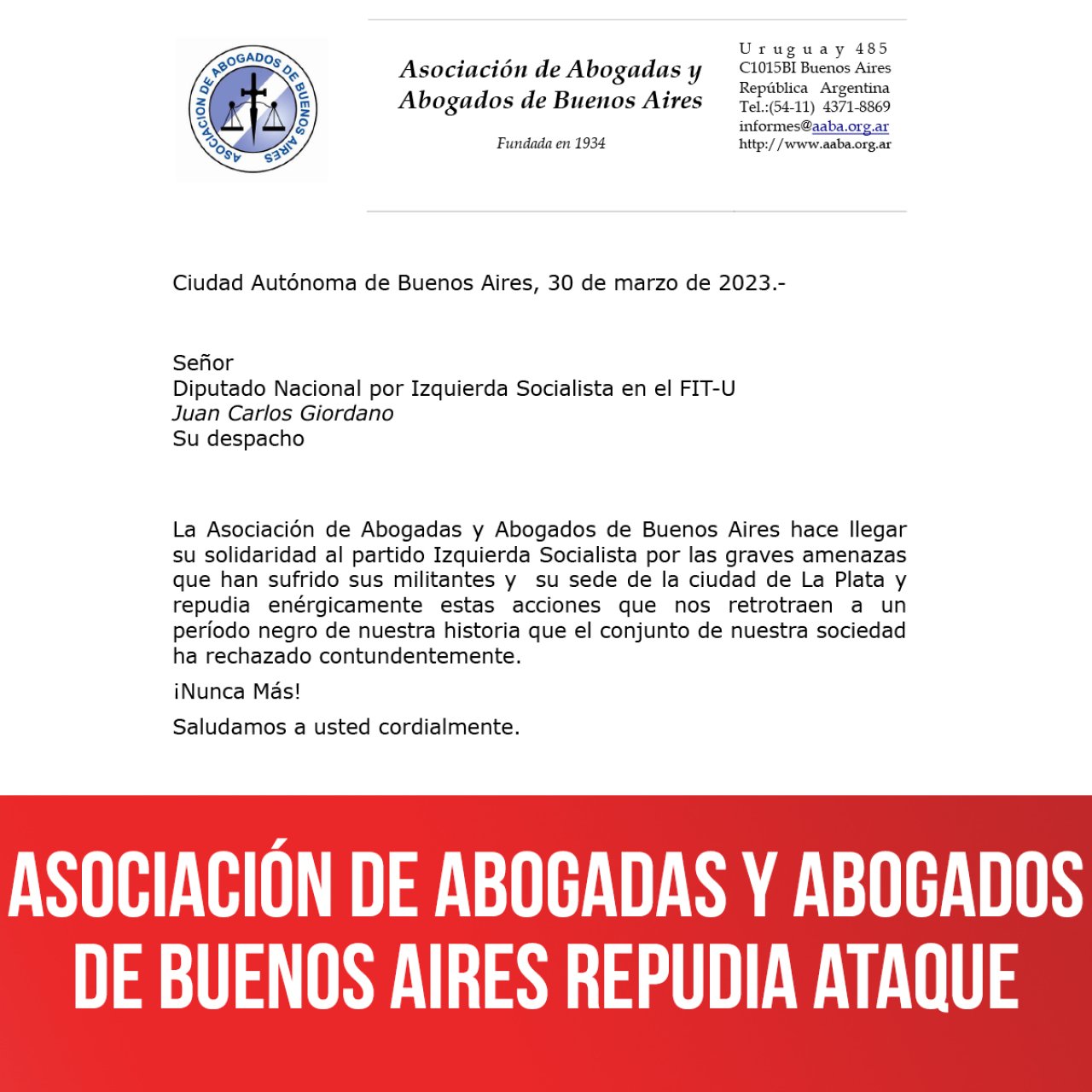 La Asociación de Abogadas y Abogados de Buenos Aires hace llegar su solidaridad al partido Izquierda Socialista por las graves amenazas que han sufrido sus militantes y su sede de la ciudad de La Plata y