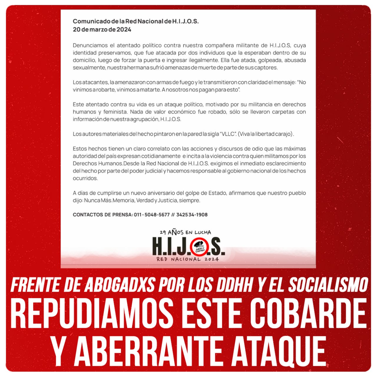 Desde el Frente de Abogadxs por los DDHH y el Socialismo (FADHUS) repudiamos este cobarde y aberrante ataque contra una compañera de HIJXS.