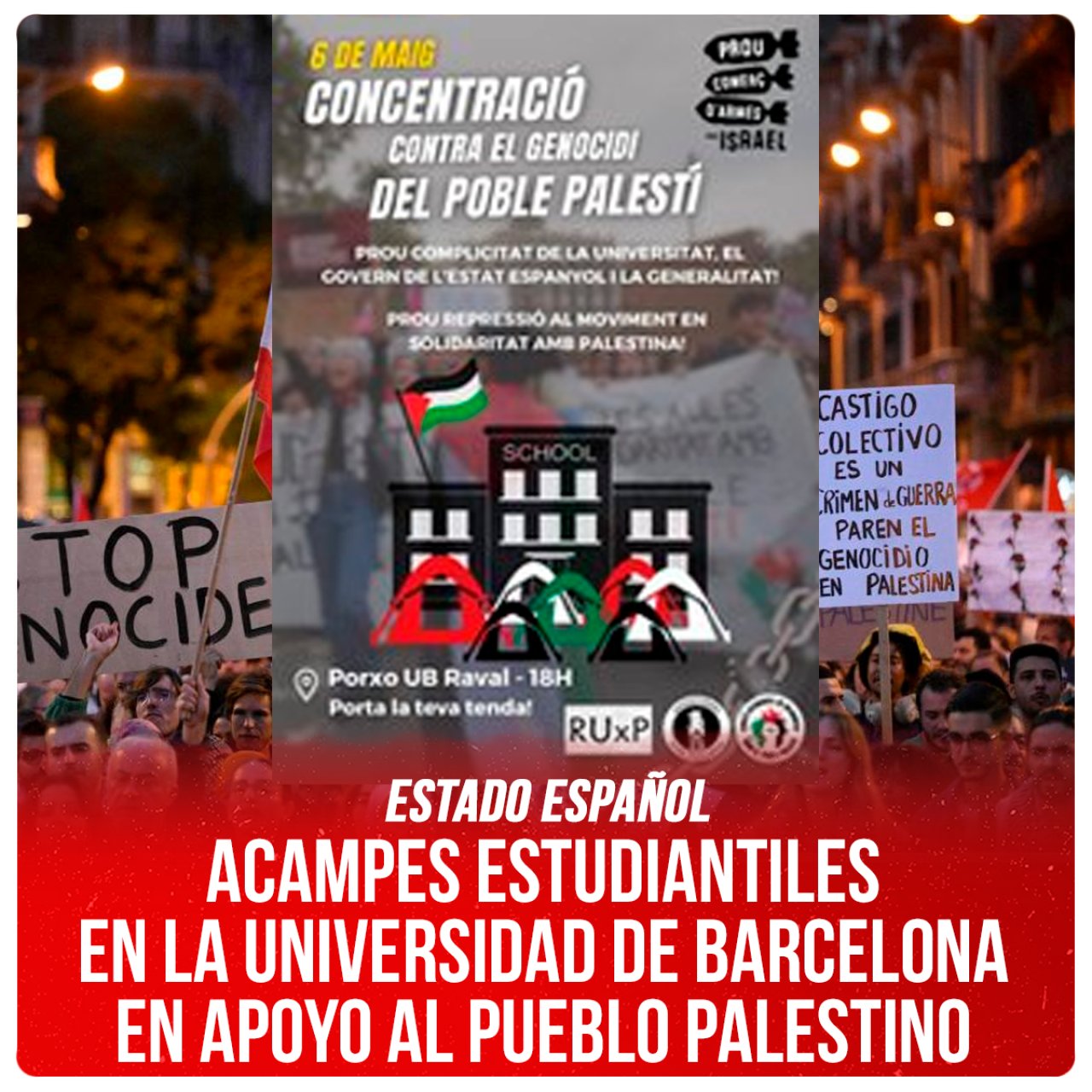 Sin embargo, como en muchos casos, la represión no ha hecho más que hacer crecer el movimiento, ganar más apoyos y que las acampadas cada vez lleguen a más ciudades del mundo. En este sentido, el movimiento estudiantil de la Universidad de Barcelona está convocando a ocupar el Edificio Histórico a partir de este lunes 6 de mayo. Exigen la ruptura de relaciones académicas de la universidad con las instituciones sionistas, pero también con todas las empresas cómplices del apartheid con las que se tienen convenios de colaboración. También denuncian al Gobierno del Estado, que ha mantenido el comercio de armas con Israel, y al Gobierno de Catalunya, que mantiene también todos sus vínculos.