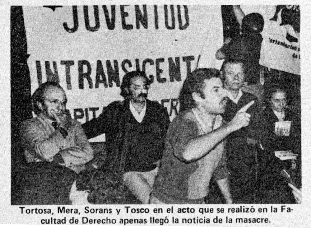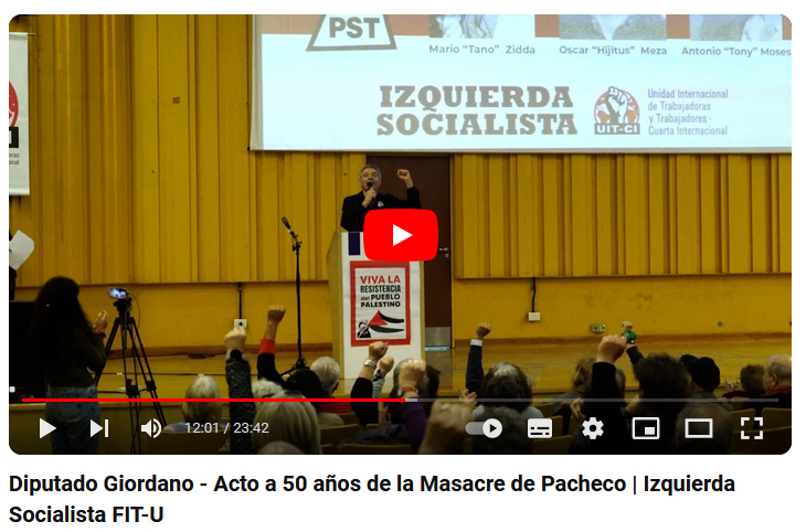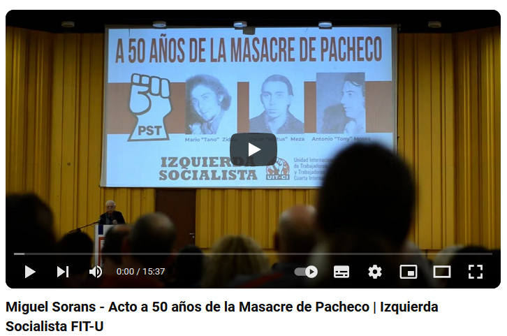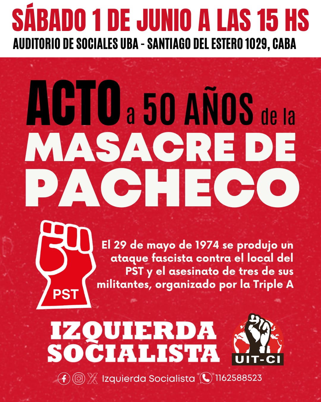 Sábado 1/6 15 horas Con motivo de cumplirse el 50 aniversario del brutal ataque fascista sufrido por nuestro glorioso PST en el local de Pacheco, Izquierda Socialista realizará un acto en homenaje a los compañeros asesinados en esa ocasión. Será el próximo día 1 de junio en el Auditorio de la Facultad de Ciencias Sociales a las 15 horas. |