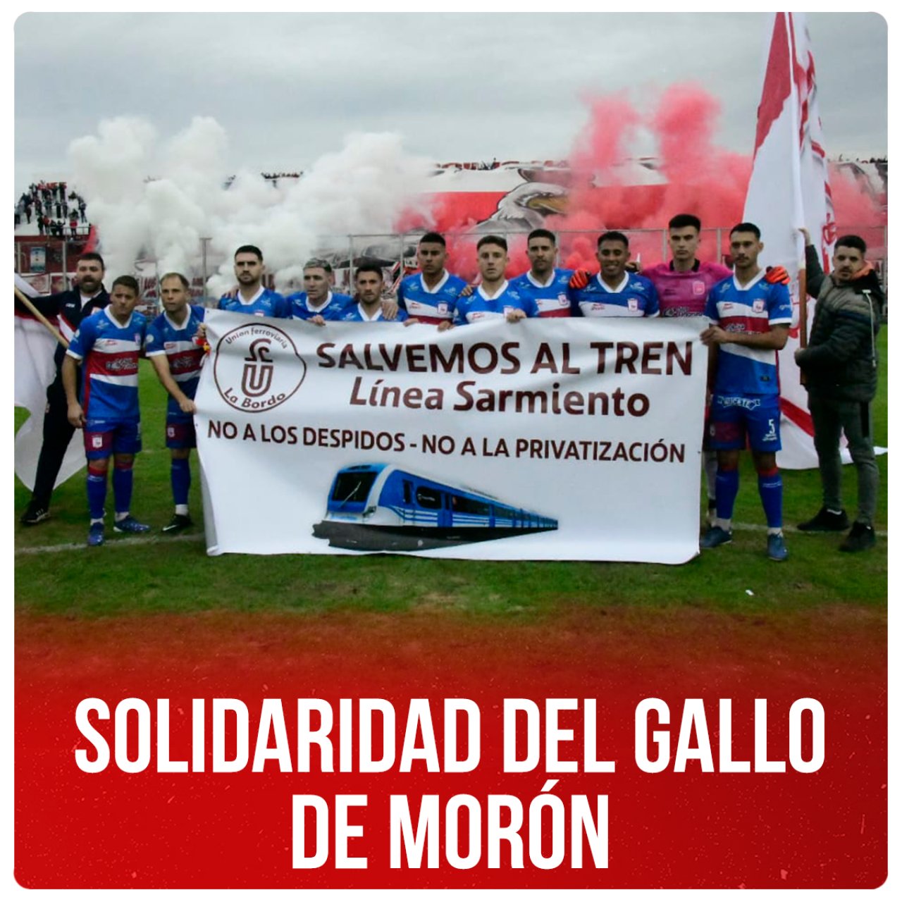 En la fecha 18 del torneo de Primera Nacional, el Club Deportivo Morón se solidariza con la campaña del Cuerpo de Delegados y Comisión Ejecutiva, con el lema SALVEMOS AL TREN en el que denunciamos al gobierno del ultraderechista Milei el plan de ajuste que quiere descargar sobre los trabajadores anunciando en una primera etapa 3 mil despidos y a traves de la ley Bases poder privatizar los ferrocarriles. Agradecemos al Gallo de Morón por su enorme solidaridad y compromiso.