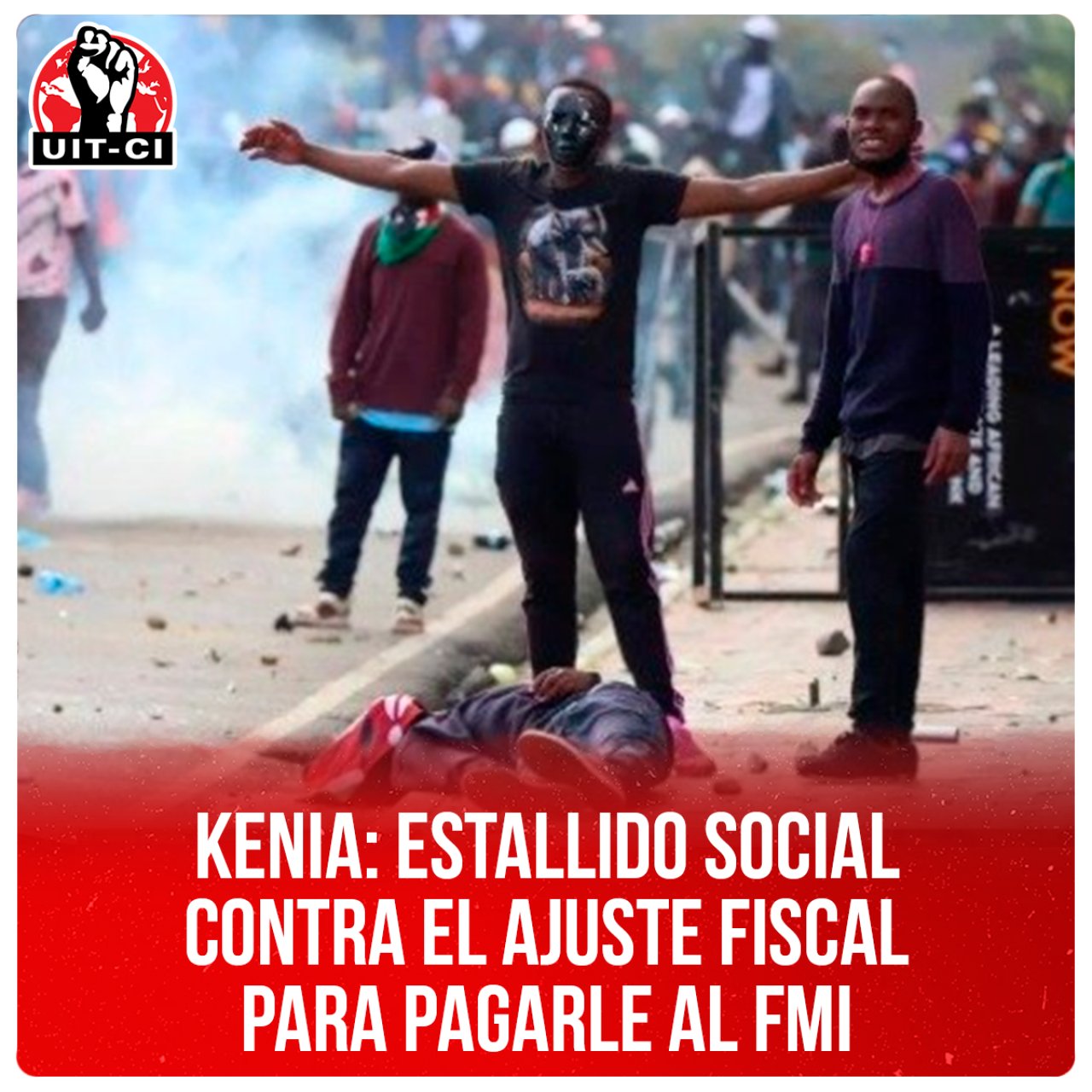 Desde la Unidad Internacional de Trabajadoras y Trabajadores (UIT-CI) apoyamos al pueblo trabajador de Kenia que enfrenta legítimamente a su gobierno y las políticas hambreadora del FMI. Llamamos a los pueblos del mundo a repudiar la represión y la militarización a la vez que exigimos justicia por los manifestantes asesinados y el inmediato castigo a los responsables materiales y políticos. ¡Viva la lucha del pueblo trabajador de Kenia! ¡Abajo el presupuesto de Ruto y el FMI! ¡Basta de Represión! ¡Justicia para los caídos y castigo a los culpables!