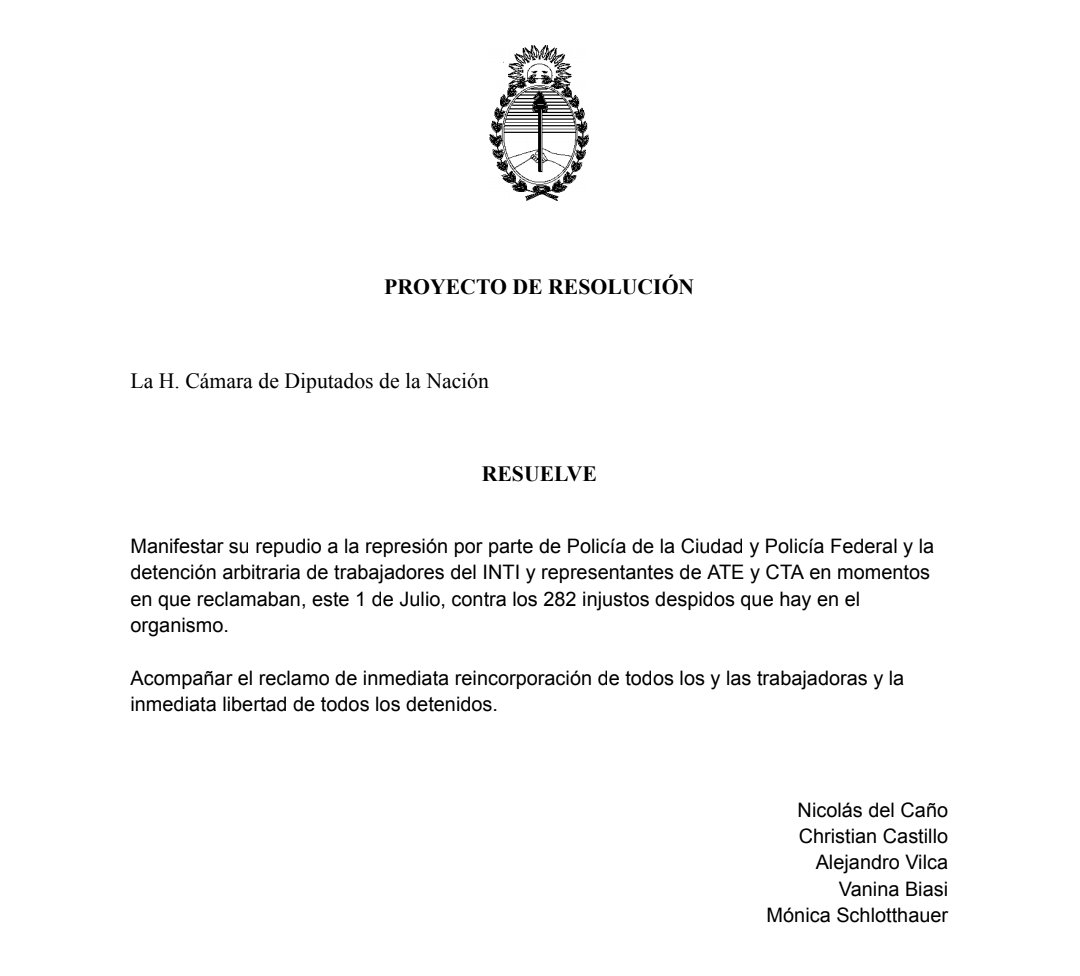 Presentamos proyectos de repudio a la represión y los despidos en el INTI y el Hospital Posadas. Denunciamos la inacción de la CGT que está borrada ante al avance de la motosierra. Reclamemos a sus dirigentes un paro de 36hs y un Plan de Lucha unificado de la CGT y las CTAs.