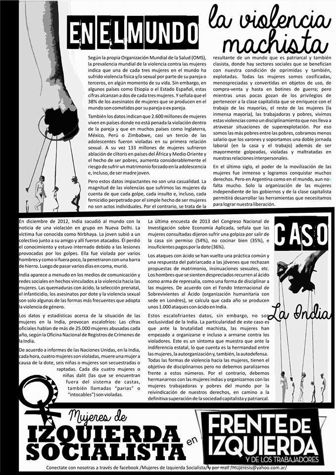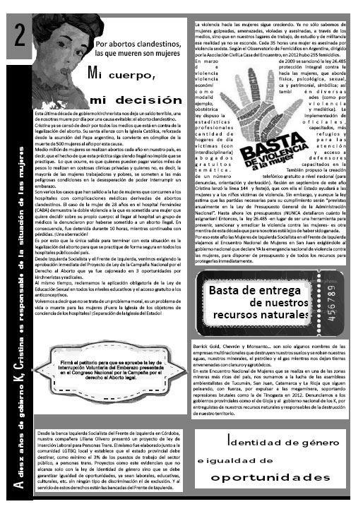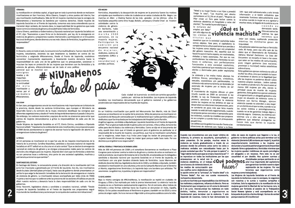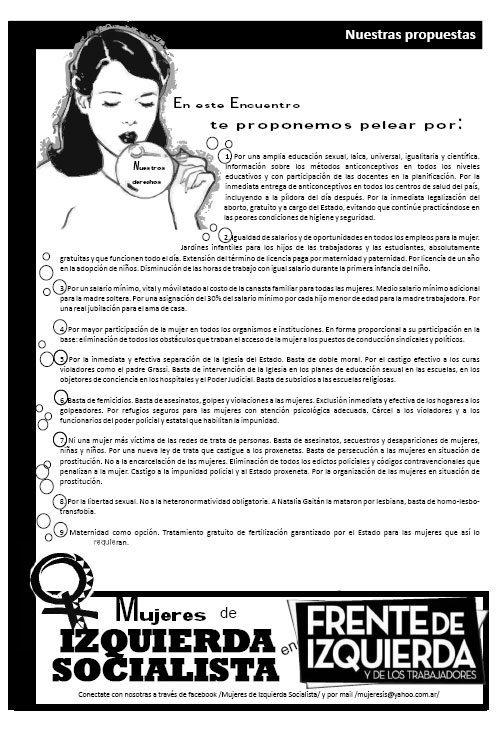Desde Isadora e Izquierda Socialista en el Frente de Izquierda-Unidad elaboramos este dossier de lectura que recupera algunos de los textos escritos y publicados en la revista “La rebelión de las  mujeres”. En el mismo, encontrarán un análisis del origen de la opresión patriarcal y su combinación con la explotación capitalista desde una óptica marxista y la caracterización del movimiento de  mujeres como policlasista (páginas 2 a 4). Una comparación entra las distintas corrientes que intervienen en el movimiento; la mayoría de ellas para frenarlo y evitar que se desarrolle pero con  nuestro feminismo socialista impulsamos la movilización y a la vez damos la pelea para que el patriarcado y el capitalismo caigan juntos (páginas 5 a 6). Un breve recorrido por la historia del movimiento  y sus luchas para obtener la igualdad de derechos respecto a los varones, quienes ya habían logrado conquistas al calor de las revoluciones democrático-burguesas (página 7 a 11). Por  último, están desarrollados los puntos programáticos centrales que impulsamos con Isadora (página 12 a 18).