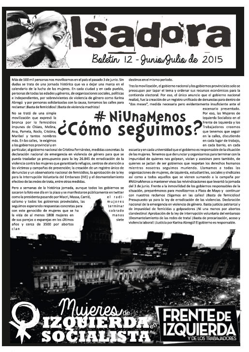 Hoy, nos proponemos este nuevo desafío que es construir Isadora como una gran organización de mujeres en lucha. Después de gritar #NiUnaMenos en todas las plazas del país el 3J de 2015, muchas sacamos la conclusión de que es necesario que nos organicemos para que dejen de matarnos porque #VivasNosQueremos. Estamos convencidas que la fuerza de las mujeres es enorme, que podemos hacer temblar la tierra como se demostró el último 8M y que somos capaces de alcanzar todo lo que nos propongamos si lo hacemos juntas. Por eso, Isadora es un espacio al que te invitamos a participar, a debatir y a ser parte para dar esta pelea con más fuerza.