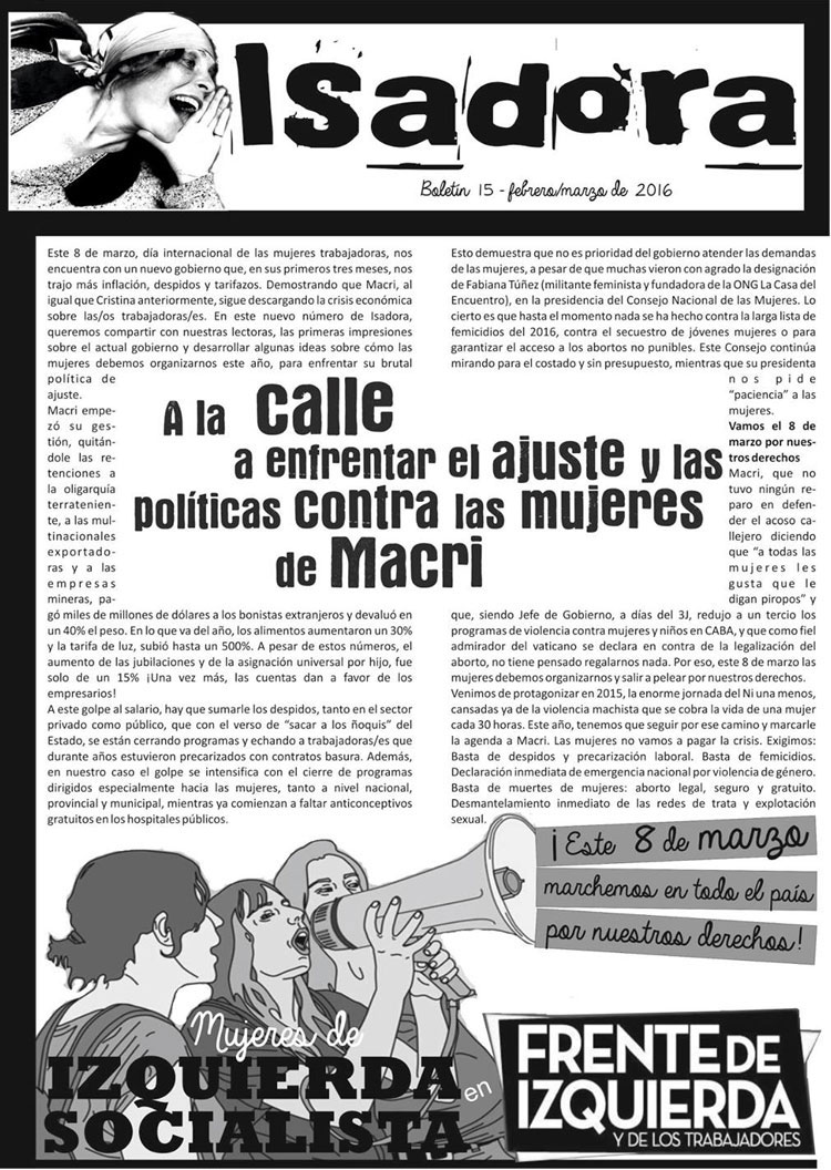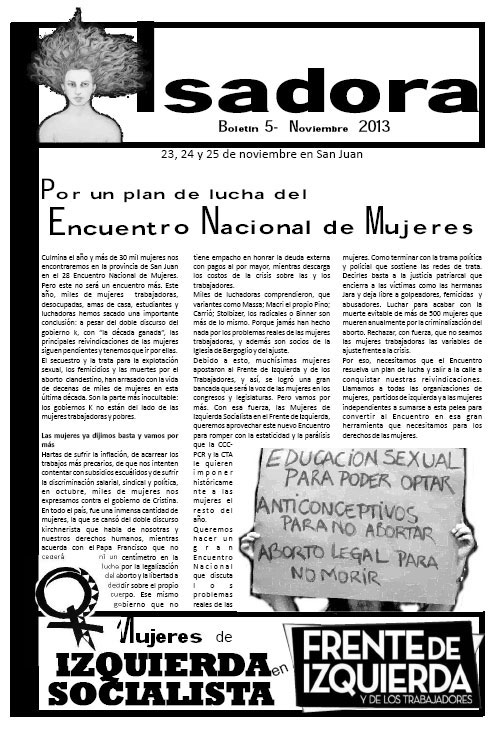 Hace cinco años escribíamos nuestro primer boletín Isadora, un folleto que fue mostrando distintos debates y la postura de Izquierda Socialista en relación a las problemáticas que nos atraviesan como mujeres y trabajadoras. Cuando lo imprimimos por primera vez no imaginábamos que eso se transformaría, con el tiempo, en una agrupación de mujeres más amplia. Mujeres que luchamos, nos organizamos y peleamos con rabia para conquistar nuestros derechos.
