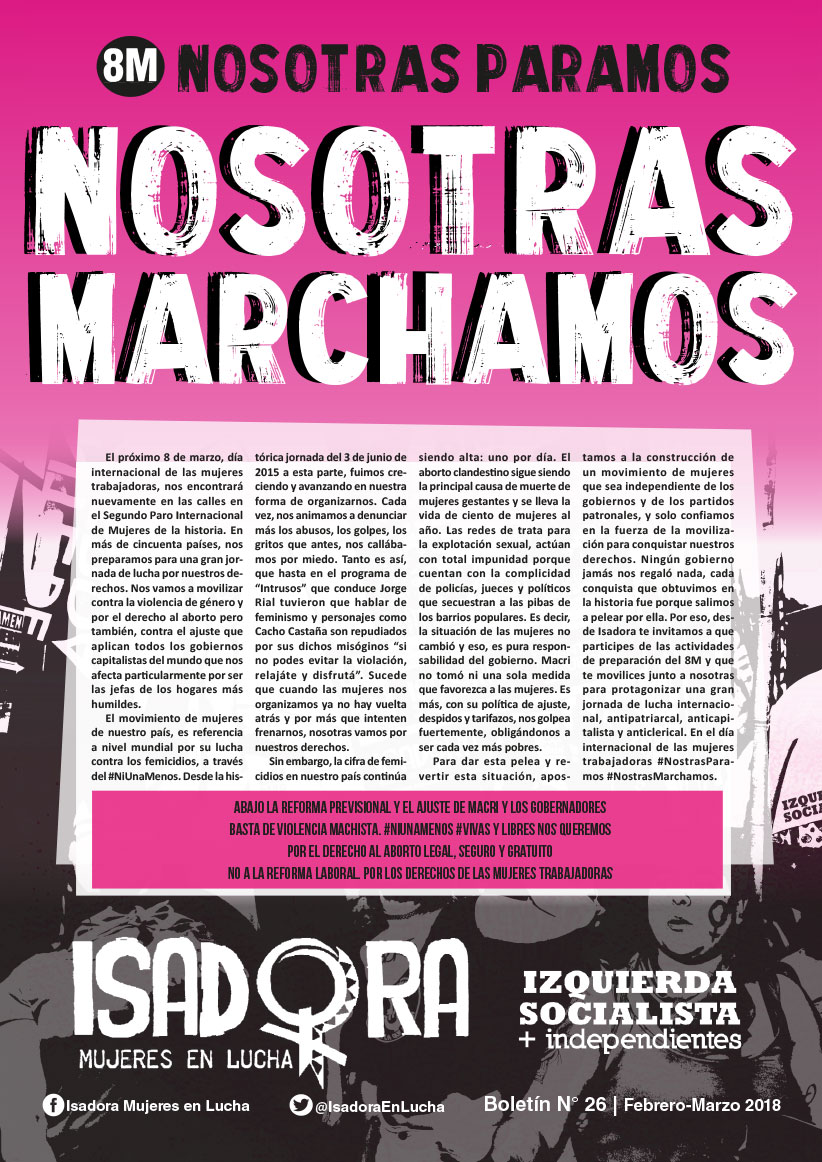 Con Isadora buscamos impulsar las luchas para cambiar las cosas. Por eso proponemos que te sumes a esta tarea y que nos organicemos juntas para hacerlo. Sabemos que no es algo sencillo ni fácil, pero estamos convencidas de que, aunando nuestras fuerzas, lo vamos a lograr. Porque ya nos vieron en las calles, con lluvia, con frío, bajo el sol y no nos cansamos, porque somos mujeres y no vamos a parar hasta cambiarlo todo. Y tirar abajo de una vez por todas, este sistema capitalista y patriarcal que nos oprime y explota cada día más.
