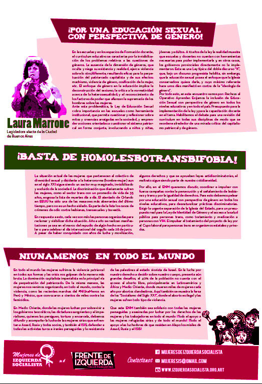Desde Isadora e Izquierda Socialista en el Frente de Izquierda-Unidad elaboramos este dossier de lectura que recupera algunos de los textos escritos y publicados en la revista “La rebelión de las  mujeres”. En el mismo, encontrarán un análisis del origen de la opresión patriarcal y su combinación con la explotación capitalista desde una óptica marxista y la caracterización del movimiento de  mujeres como policlasista (páginas 2 a 4). Una comparación entra las distintas corrientes que intervienen en el movimiento; la mayoría de ellas para frenarlo y evitar que se desarrolle pero con  nuestro feminismo socialista impulsamos la movilización y a la vez damos la pelea para que el patriarcado y el capitalismo caigan juntos (páginas 5 a 6). Un breve recorrido por la historia del movimiento  y sus luchas para obtener la igualdad de derechos respecto a los varones, quienes ya habían logrado conquistas al calor de las revoluciones democrático-burguesas (página 7 a 11). Por  último, están desarrollados los puntos programáticos centrales que impulsamos con Isadora (página 12 a 18).