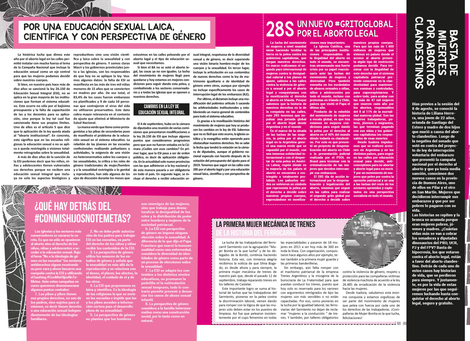 Nos mueven las ganas de cambiar las cosas, de cambiar esta sociedad podrida en la que unos pocos se benefician con el trabajo de la mayoría. Estamos hartas de que el trabajo doméstico recaiga solo en las mujeres, que nos acosen en el trabajo o que nos discriminen, que nos griten en la calle, que se burlen de nuestros cuerpos y de nuestra ropa, que seamos vistas como objetos que deben satisfacer al varón sin importar nuestras ganas. Estamos cansadas de que nos juzguen por no elegir la maternidad obligatoria o que nos critiquen por nuestros deseos sexuales.