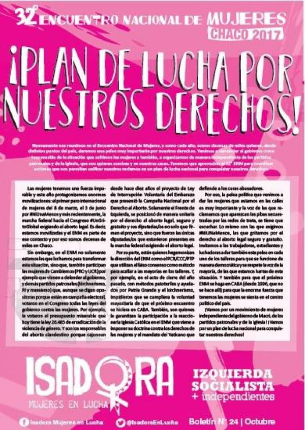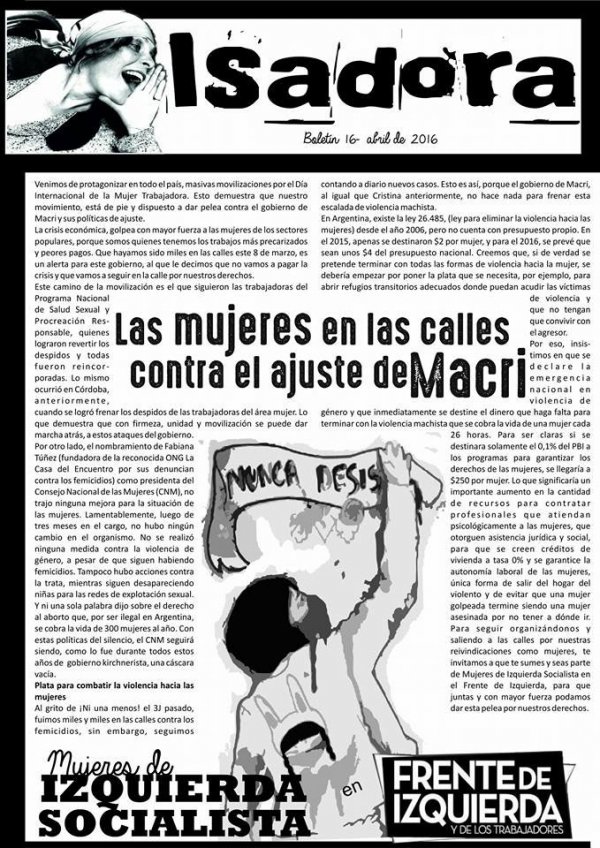 Las mujeres de Izquierda Socialista junto con compañeras independientes, decidimos impulsar una nueva agrupación de mujeres en lucha: Isadora. En este espacio confluimos mujeres trabajadoras, estudiantes y de los sectores populares que nos proponemos esta nueva forma de organizarnos para pelear mejor por nuestros derechos. Te invitamos a que seas parte y que te sumes a este nuevo desafío.