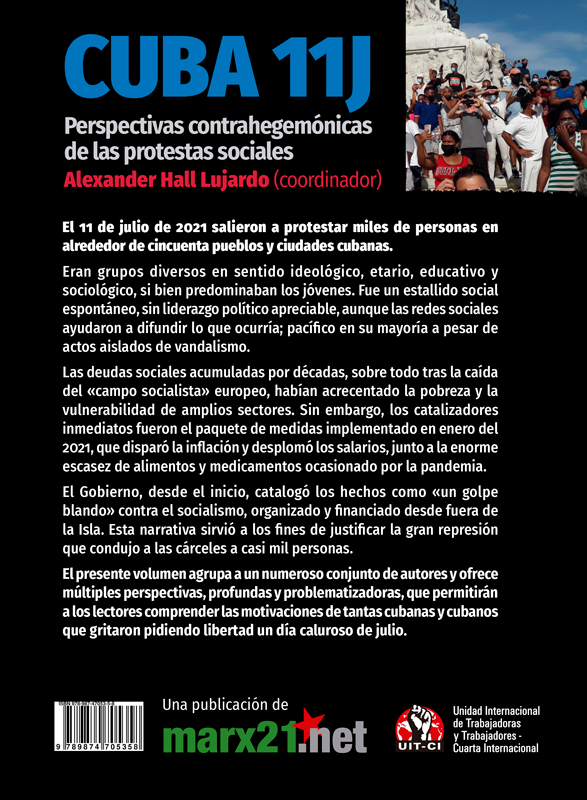 Presentamos la segunda edición colaborativa, en versión digital, del libro Cuba 11j. Perspectivas contrahegemónicas de las protestas sociales. Fue coordinado por el joven historiador Alexander Hall Lujardo, integrante de la izquierda crítica cubana y activista afrocubano por el socialismo democrático. Es una edición conjunta entre la Marx 21.net, integrante de la Corriente Socialismo Internacional (SI) y la Unidad Internacional de Trabajadoras y Trabajadores-Cuarta Internacional (UIT-CI). Esta segunda edición incorpora un artículo de Miguel Sorans y Pablo Almeida, dirigentes de Izquierda Socialista, de Argentina, y de la UIT-CI. El libro da testimonio de la riqueza y diversidad de la izquierda crítica e independiente de Cuba. Las protestas masivas del 11 de julio de 2021, en La Habana y en todo el país, marcaron un antes y después en la Isla. Los artículos reconstruyen minuciosamente la crisis económica, social y política por las que estallaron las protestas.