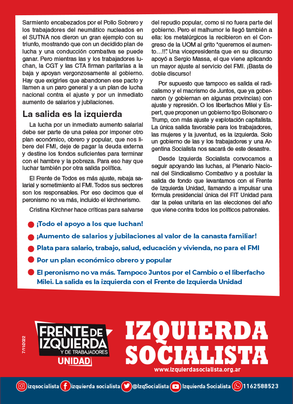 La lucha por un inmediato aumento salarial debe ser parte de una pelea por imponer otro plan económico, obrero y popular, que nos libere del FMI, deje de pagar la deuda externa y destine los fondos suficientes para terminar con el hambre y la pobreza. Para eso hay que luchar también por otra salida política.