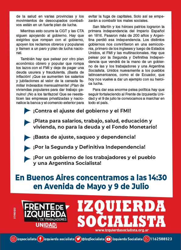 El próximo sábado 9 de Julio el Frente de Izquierda Unidad llama a marchar a Plaza de Mayo y a las principales ciudades del país en otro aniversario de la primera independencia nacional. La marcha se hará en unidad con el movimiento de desocupados combativo y el sindicalismo combativo. Vamos a decirle no al pacto del gobierno con el FMI y a su plan de ajuste, entrega, saqueo y dependencia.