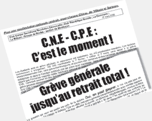 Es el volante distribuido por varias agrupaciones, entre ellas La Commune, sección de la UIT-CI. Entre otros conceptos, dice: «Si, se puede ganar, si no se tiene miedo de expulsar a Chirac, De Villepin y Sarkozy. Porque una huelga general interprofesional con manifestacion masiva en Paris…es para enfrentar al poder, denunciar su ilegitimidad total, mostrar la fuerza de la mayoría, esto es abrir la vía a su caída, a su salida «anticipada»... Es el momento en que es posible lograr un objetivo: huelga general hasta el retiro del CPE... Club Liga Socialista Revolución Democrática, Club República Social, La Commune, El Militante, Grupo de Rocles. |