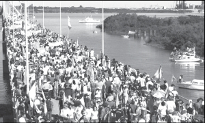 El pasado domingo, a dos años de la primer asamblea contra la instalación de las papeleras, más de 100.000 personas manifestaron frente al puente internacional en Gualeguaychú. Ocuparon más de 3 kilómetros de la ruta 136 en un abrazo simbólico al río Uruguay. Familias enteras con sus niños, adolescentes y abuelos se hicieron presentes. También ambientalistas de Fray Bentos, Montevideo y Helsinki (Finlandia). Organizado por 16 comisiones de vecinos, en el acto se cantaron el himno argentino y uruguayo y se leyó una proclama que denuncia a Botnia y a los gobiernos cómplices. A Kirchner le dedicaron un pasacalle que decía “Gualeguaychú es nuestro Calafate”, y “Venimos con el mismo clamor que se repite desde el año 2003 cuando Botnia aún no había colocado siquiera un ladrillo”. Esta extraordinaria marcha es una cachetada a la política de Kirchner y Tabaré de intentar frenar la movilización y la lucha con el supuesto diálogo con España. La marcha “exigió que Botnia y Finlandia se retiren” y llamó a “defender el río, sus arroyos y tierras de todo tipo de contaminación presente y futura». “Botnia es ilegal y no tiene ni tendrá la licencia social de nuestro pueblo”, señalaron. |