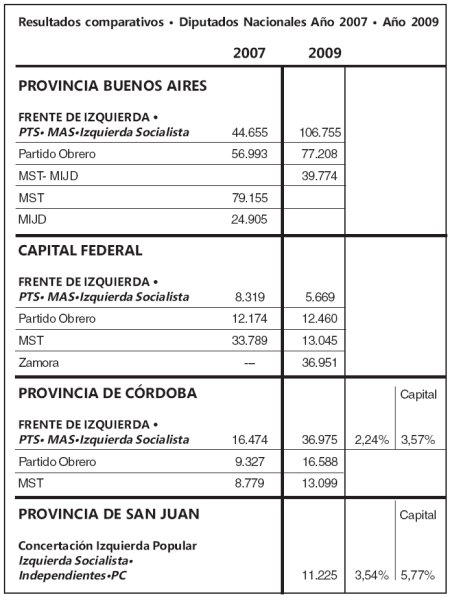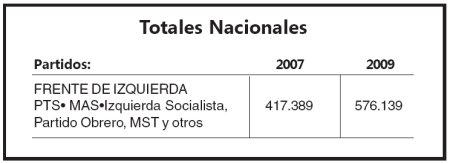 La izquierda sacó más de medio millón de votosEn medio de la polarización en muchos distritos, sumado al hecho de que no hubo mucho espacio para la izquierda en estas elecciones, los partidos que conformamos ese espacio sacamos casi 580.000 votos en todo el país (ver cuadro), 158.750 más que en 2007. Un modesto resultado, pero muy importante. Dentro de ello, el único Frente de Izquierda que conformamos entre el PTS-MAS-Izquierda Socialista cosechó 187.000 sufragios. El Frente logró el quinto lugar y fue la primera fuerza de la izquierda en el estratégico distrito de la provincia de Buenos Aires, Córdoba y San Juan. Un premio a la unidad, que rechazaron tanto el PO de Altamira-Pitrola como el MST de Vilma Ripoll.