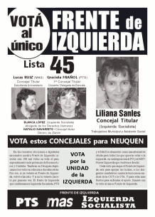 El domingo 23 se vota para renovar la mitad de los concejales. Actualmente el municipio está gobernado por una alianza entre justicialistas, radicales y el UNE (partido provincial que tiene el control político de la CTA). Están íntimamente ligados a Cristina, al igual que el MPN de Sapag. Todos avalaron las leyes provinciales que prorrogaron la entrega de los pozos petroleros por diez años más. Ninguno reclamó por mayores regalías que beneficiarían al municipio vía la coparticipación. Mientras tanto, trabajadores de salud y docentes tuvieron que parar un mes por un mísero aumento de sueldos, al igual que los empleados municipales el año pasado. No hay que votar estos candidatos porque seguirán gobernando para Repsol y los banqueros. En estos momentos de grave crisis en que el pueblo sufre la falta de viviendas y de servicios públicos en el 40% de la ciudad, y sigue creciendo la desocupación y la pobreza, se necesitan en el Consejo Deliberante trabajadores y luchadores que no se vendan. Por eso, los candidatos del FRENTE de IZQUIERDA proponemos: • Ante el déficit de 20.000 viviendas que hay en la ciudad, proponemos destinar el ingreso por regalías de gas y petróleo para construir casas y proveer de servicios públicos (luz, agua, gas, cloacas y mensura) a los más de 40 barrios que carecen de los mismos. • Gravar con impuestos extraordinarios a las grandes empresas radicadas en la ciudad que se llevan las utilidades afuera, como son los hipermercados, la Coca Cola, las petroleras, las mineras y los bancos. • Por un transporte público municipal. No al actual sistema privado que se lleva subsidios y presta pésimos servicios. • Asistencia alimentaria con almuerzo y cena, y asistencia sanitaria para los niños carenciados de la ciudad mientras perdure la desocupación. Así los sacaremos de los basurales, de la calle y la droga. • Impulsar la expropiación y estatización de Zanón bajo control obrero, para abastecer el plan de obras públicas. |