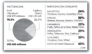 La patronal estadounidense, dueña en Argentina de la ex Terrabusi, está intentando comprar al grupo británico Cadbury -el segundo fabricante de golosinas más grande del mundo-, ofreciendo pagar la friolera de 16.700 millones de dólares. Kraft Foods Inc. es el mayor grupo alimentario de América del Norte. El objetivo es pasar a ser “una potencia global en snacks, golosinas y comidas rápidas” con ingresos combinados de alrededor de 50.000 millones de dólares (Reuters, Londres), y ahorros por 625 millones. Esa fusión, en Argentina, implicaría la de la ex Terrabusi y Stani, en pelea por el mercado contra Arcor y Milka. Si se diera, Kraf y Cadbury facturarían, igual que Arcor, 2.316 millones de pesos. (Clarín, 8-9). |