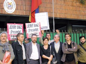 No es el primer dirigente clasista asesinado… No, todo lo contario. En el estado de Aragua, han sido asesinados siete dirigentes sindicales pertenecientes a nuestra corriente C-Cura en los últimos cuatro años. Richard Gallardo, presidente de la UNT de ese estado, así como Luis Hernández y Carlos Requena, quienes en vida fueran de la coordinación de la central obrera, fueron fusilados en noviembre de 2008. Luego hicieron lo mismo con Ramiro Ponce, Luis Delgado y Edraas Vásquez. También con Argenis Vásquez, dirigente de Toyota, durante una huelga. Todos estos crímenes siguen impunes. Por eso es que estamos denunciando que lo de Jerry Díaz no es un caso aislado. Su muerte es parte de la violenta ofensiva que venimos sufriendo contra el sindicalismo combativo, clasista y autónomo. Por eso el paralelismo sindical, el desconocimiento de los procesos electorales en los sindicatos cuando los resultados le son adversos. Esta ofensiva es alentada y apoyada directamente por el ministerio del Trabajo, las inspectorías y los sindicaleros rojos rojitos (afines al gobierno), que desconocen la voluntad de las bases obreras. Así también se envalentona a los patronos privados; entre todos intentan liquidar a nuestra corriente C-Cura, y a la UNT de Aragua. Pero es en todo el país, con dirigentes y trabajadores presos, o con regímenes de presentación y otras medidas cautelares. Hace desde el año pasado que venimos reclamando contra la criminalización de las protestas sindicales por parte del gobierno. ¿Han podido avanzar en las denuncias ante la justicia? No hay voluntad política del gobierno de investigar. En este marco de impunidad es que el sicariato toma más fuerza, ya que no hay ningún caso esclarecido. Cuando fue el asesinato de nuestros compañeros en noviembre de 2008, dijimos abiertamente a todas las autoridades que había un grupo de sospechosos, no los acusábamos directamente, que debían ser investigados, como los dirigentes como Tomas Pérez, de la construcción, y Alexis Díaz, muy cercanos al alcalde del Municipio Zamora, miembro del PSUV. Y que ahora también lo son. Exigimos a la justicia que actuara. Pero hasta ahora, nunca fueron tomadas estas denuncias, ni citados por las autoridades judiciales para investigar estas sospechas. ¿Cuáles son las propuestas de C-Cura y la USI ante este nuevo ataque del sicariato? Una vez más hemos recibido el apoyo solidario de sindicatos, dirigentes y trabajadores de Venezuela y también de otros países. Nosotros volvemos a insistir en que hay que movilizarse, que es necesaria una gran movilización obrera, popular y democrática para frenar al sicariato. Hacemos un llamado a todos los partidos políticos, sin excepción, y a todas las corrientes sindicales, incluidas las que están en la UNT y son voceros del gobierno, a que se pronuncien por el fin del sicariato. Hace falta mucha unidad de acción para acabar con la impunidad y lograr por parte del gobierno nacional y la justicia que abandonen su inacción, para lograr la investigación y castigo a los responsables intelectuales y materiales del asesinato de Jerry Díaz y de los demás compañeros. Embajada de Venezuela: Fuimos a manifestar el repudio