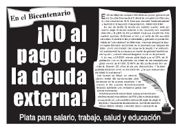 ¡No al pago de la deuda externa!Folleto de Izquierda Socialista que se está reparatiendo en lugares de trabajo, universidades, plazas y barrios llamando a no pagar la deuda externa en este Bicentenario