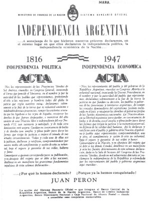 Doscientos años de la “Argentina” (Parte II)Del 17 de octubre al BicentenarioEn 1947 el gobierno de Perón decretó la “independencia económica” y labró un acta en Tucumán que se presentó como una continuidad del Acta de la independencia de 1816 (ver reproducción en esta página). Sesenta años después está a la vista que Argentina es un país sujeto a los dictados del FMI, con una colosal deuda externa y una economía dominada por pulpos imperialistas que nos desangran y hunden en la miseria a los trabajadores. La tarea que muchos creyeron que Perón encabezaría sigue pendiente: la Segunda Independencia.