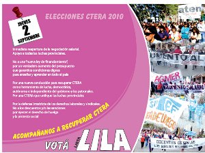 ¿Cómo vivís el paso unitario que dimos con la Lila? En primer lugar, ratifica todo lo construido en el año 2007 y la continuidad que se le ha dado a una lista nacional con fuerte contenido clasista, por un lado, y apoyada fuertemente en la base. Evidenció algo que veníamos sosteniendo desde el primer momento de su concreción: no era una simple lista testimonial, electoralista, sino por el contrario, pudo avanzar en muchas acciones que fueron impulsadas a nivel nacional, como el paro a un año de la muerte del compañero Carlos Fuentealba y la asistencia en todos los conflictos provinciales con representación de compañeros de distintas jurisdicciones que son parte del frente. Es sin duda una construcción unitaria que tiene una dirección clara, como lo es la recuperación de la CTERA, la unificación de las luchas y por sobre todas las cosas, el contacto directo con las bases, lo que nos ha llevado a ratificar mandatos, consolidar otros y ganar espacios en otras jurisdicciones caso AGMER. ¿Por qué hay que votarla? Precisamente por los ejes de nuestra campaña, sostenidos en lo antes mencionado, -en la independencia del poder político que ha cooptado a la conducción Celeste y por ende impide la posibilidad de concretar una fuerte lucha nacional ya que aíslan los conflictos-. Hay que votar a la Lila porque su mayor sustento está en el respeto a los compañeros y a las decisiones adoptadas de conjunto. Hay que votar a la Lila porque garantiza democracia y participación. Hay que votar a la Lila porque todo lo antes dicho lo hemos demostrado en donde somos conducción y se ha mantenido esta línea en todos los aspectos. ¿Querés agregar algo más? Simplemente felicitar a los cumpas que entendieron, aceptaron, comprendieron y conformaron este espacio de construcción que surge como una herramienta para los compañeros. Un espacio donde hay debate, disenso, pero por sobre todas las cosas, prima el único criterio que nos moviliza y que es tener una conducción de la CTERA que responda a las demandas de tantos compañeros. Agradecer por supuesto los esfuerzos que cada uno está haciendo permanentemente, no solo para esta elección, sino fundamentalmente para darle continuidad a una línea gremial verdaderamente democrática, que es lo primordial en esta historia. Apoyá a estos candidatos