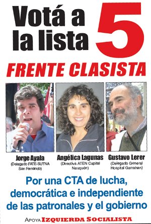 A pocas semanas de las elecciones de la CTA, los dos sectores burocráticos que disputarán la conducción de CTA, siguen alejados de las necesidades de los trabajadores: el salario, las condiciones de trabajo y la lucha contra los despidos. Los trabajadores enrolados en los gremios que pertenecen a la CTA no dejan de dar muestras de su necesidad de salir a pelear. Los docentes de provincia de Buenos Aires pararon masivamente por 48 horas el 1 y 2 de septiembre pese a que la medida fue convocada por UDOCBA, gremio duhaldista, y no por el Suteba, cuyos dirigentes, con Baradel a la cabeza, integran la lista 10 de Yasky en la provincia. En ATE Provincia de Buenos Aires, la directiva conducida por Cachorro Godoy -candidato provincial de la lista 1 de Micheli – llamó a un paro el 26 de agosto luego de meses de postergar la convocatoria exigida desde las bases. Los estatales dieron muestras que les sobra voluntad de luchar por sus reivindicaciones parando masivamente y miles movilizándose a La Plata. También demostraron, en varias seccionales, que quieren pelear en serio y no con paros y medidas aisladas como viene impulsando el Consejo Directivo Provincial. En Tres de Febrero, por ejemplo, se votó y se llevó a cabo un paro de 72 horas en lugar de las 24 que proponían Godoy y compañía. En Paraná Metal, los trabajadores pertenecientes a la UOM de Villa Constitución vienen cortando hace más de 5 días la autopista Buenos Aires-Rosario defendiendo los 900 puestos de trabajo contra el vaciamiento del empresario kirchnerista Cristóbal López. Los dirigentes de la CTA de ambos sectores, enfrascados en su pelea interburocrática, se niegan a brindar el apoyo necesario que requiere esta lucha para triunfar. Es más, los obreros reclaman un paro nacional a la UOM (CGT) y a la CTA, que se niega bajo el argumento que “tiene que haber un muerto por la represión” para que lo llame, como lo hizo con el asesinato de Fuentealba. Estos ejemplos, que involucran tanto a sectores dirigentes de la lista 1 de Micheli como a los de la lista 10 de Yasky, son una muestra más que ninguno de ellos son alternativa. Para poder pelear por salario, por las condiciones de trabajo, contra la precarización laboral y contra los despidos hace falta una nueva conducción en la CTA. En este marco, la conformación de la lista 5 – Frente Clasista es un gran paso adelante, ya que es la única alternativa unitaria de sectores combativos y antiburocráticos. Integrada por dirigentes de algunos de los procesos genuinos más importantes que se vinieron dando al interior de la CTA y por distintos sectores políticos sindicales de izquierda. Con compañeros de Fate del SUTNA San Fernando, como Jorge Ayala; Angélica Lagunas, en representación de la histórica lucha docente neuquina y Gustavo Lerer, del Garrahan, también la integran María Inés Giménez, de judiciales de Buenos Aires, y destacados compañeros de INDEC, ATE de distintas provincias y SUTEBA. Las elecciones del próximo 23 de septiembre serán una gran oportunidad para pelear por una nueva dirección democrática y de lucha para la CTA. Para ello llamamos a apoyar a la lista 5. Acto de la Lista 5Hotel Bauen viernes 17 de septiembre 18:30 hs. Hablarán los principales candidatos No al fraudeSi hay algo en lo que están de acuerdo Yasky y Micheli es que existen amplias posibilidades de fraude. Ya se han cruzado varias acusaciones mutuas. Si ellos lo dicen… Además, para que no se puedan expresar distintos sectores opositores, han hecho una serie de maniobras, inflando padrones o cambiando lugares de votación. Ya hay ejemplos. En la seccional Lomas de Zamora -donde la oposición dirige ATE y es fuerte en Docentes-, inflaron el padrón a más de 26 mil afiliados con distintos movimientos sociales, cuando entre los distintos gremios de la zona hay sólo 7 mil trabajadores afiliados. En Neuquén, las urnas no van a pasar por las escuelas, impidiendo que el opositor sindicato ATEN, el más importante de la CTA, pueda votar en las mismas, obligando a los docentes a asistir al Consejo Provincial de Educación, impidiendo, de esa forma, un voto masivo del sector. Situaciones similares se vivirán en Capital y Provincia de Buenos Aires, donde habrá muchísimas más urnas en comedores del MTL-PC y otras organizaciones territoriales y de desocupados, que en reparticiones públicas y escuelas. Claramente una “ingeniería” al servicio de ganar una votación con métodos burocráticos.