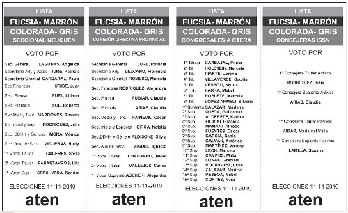 Elecciones docentes ATEN Neuquén¡Votemos al único frente opositor!El 11 de noviembre los trabajadores de la educación tenemos dos opciones: la continuidad de la Naranja en Capital y de la Azul y Blanca-Celeste en la Provincia. O cambiar estas conducciones votando al único frente de oposición Fucsia-Marrón-Colorada-Gris.