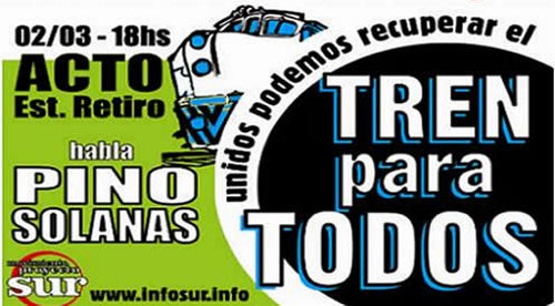 Acto de Pino por el tren¿Y la reestatización?Proyecto Sur realizará este miércoles 2 un acto “para recuperar los trenes” y por “un tren para todos”. Pino Solanas habla de “reconstruir” el sistema ferroviario pero no dice que hay que reestatizarlo, única forma de poner el ferrocarril al servicio de los trabajadores y el pueblo.