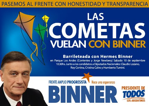 Ante el caso Schoklender, el candidato presidencial del FAP, Hermes Binner, fue y vino. Frente a la iniciativa de los diputados opositores de convocar al ex apoderado de Madres al Congreso, Binner primero se negó a participar, alegando que “nosotros no somos jueces para dirimir, sino que para eso está uno de los pilares fundamentales de la República”, a la vez que agregó que hay que exigirle “a la Justicia que actúe”. Calcado de las declaraciones de Aníbal Fernández. Ante su evidente claudicación al gobierno y las críticas que le “llovían”, cambió y sus legisladores participaron sin gran protagonismo. Binner, días antes, había llamado a una jornada de remontada de barriletes como parte de su campaña. En el caso Schoklender quiso mirar para otro lado, como remontando un barrilete, y le salió mal. Votar a Binner es perder el voto. No es ni opositor ni progresista. |