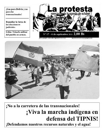 Bolivia: violenta represión a indígenasHuelga General contra Evo MoralesLos indígenas que marchaban hace 40 días para que una carretera no destruya el Territorio Indígena y Parque Nacional Tipnis, fueron víctimas de una salvaje represión policial que dejó un bebé muerto por los gases lacrimógenos, 40 heridos, muchos de gravedad, y decenas de desaparecidos. Evo dijo que “suspende la carretera”, pero ya casi nadie la cree. La Central Obrera Boliviana reafirmó el paro general que se está realizando al publicarse este periódico.