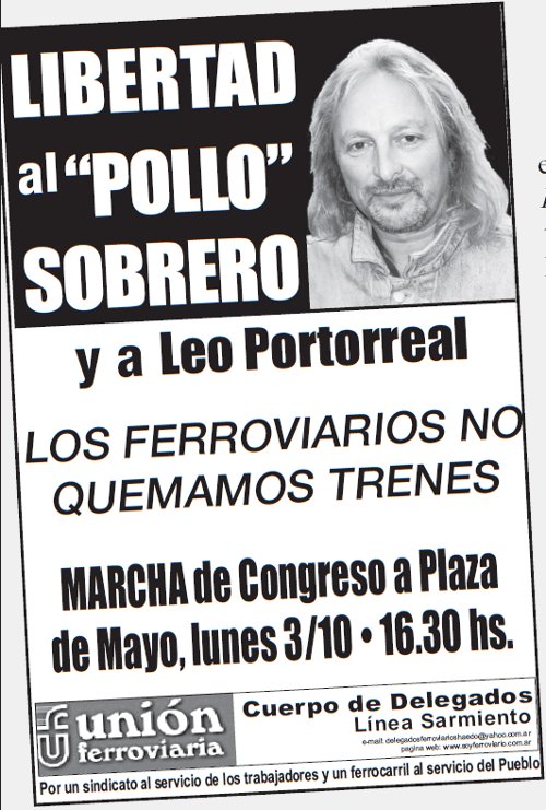 Bajo ese título, la edición del sábado de Página/12 publicó un artículo firmado por Adriana Meyer en el que relata la tradición militante del Pollo y la experiencia sindical de los trabajadores del ferrocarril Sarmiento. A continuación, reproducimos algunos extractos: Rubén Darío “Pollo” Sobrero -50 años, divorciado, cuatro hijos, vecino de Haedo e hincha de River-lidera desde hace una década el combativo cuerpo de delegados de la ex línea Sarmiento y es un referente del sindicalismo de base, opositor al histórico líder de la Unión Ferroviaria, José Pedraza. “La democracia sindical no es un delito”, dijo el dirigente, que milita en Izquierda Socialista, durante el juicio que le iniciaron en 2004, uno de los veinte procesos que tuvo por las diferentes acciones gremiales. Hace seis años fue acusado por Aníbal Fernández de haber protagonizado los incidentes derivados de la furia de pasajeros por el mal funcionamiento de los trenes, pero al momento de los desmanes Sobrero estaba en Mar del Plata en las marchas de repudio al ex presidente norteamericano George Bush. Sobrero entró en el ferrocarril en 1995. Fue varias veces candidato en distintos frentes de izquierda, aunque en estas elecciones no se postula él, sino su compañero ferroviario y del partido, Edgardo Reynoso, como primer candidato a senador nacional. “Desde que le ganó a la misma burocracia que hace casi un año asesinó a Mariano Ferreyra se propuso poner el sindicato al servicio de los trabajadores y el ferrocarril al servicio del pueblo”, explicaron sus compañeros. El planteo era “reestatizar todo el sistema ferroviario bajo control de trabajadores y usuarios, para que brinde un transporte digno y vuelva a unir al país”. Desde 2001, Sobrero y la Bordó fueron reelegidos cada dos años, por amplia mayoría, y tras diversas luchas lograron que los salarios pasaran de ser de los más bajos de la historia a los mejor pagos del sector. Además, desde que la Bordó conduce no hubo más despidos. En los intensos conflictos de 2003 y 2005 en defensa del convenio colectivo de trabajo, la Bordó se negó a firmar acuerdos con la empresa si no eran votados en asamblea. En 2003, junto a la Comisión Salvemos al Tren, repudiaron la Emergencia Ferroviaria del gobierno de Duhalde. Al año siguiente, cortaron las vías para que se les reconozca el derecho de presentar la lista Bordó en las elecciones. Esa pelea se ganó, pero Sobrero y otros 23 ferroviarios fueron judicializados. En 2009, cuando fueron absueltos, Sobrero denunció a Pedraza. “Es parte del directorio del Belgrano Cargas, es un empresario que junto a Macri y Roggio comparte jugosas ganancias; mientras el menemismo despedía a 90 mil compañeros, este personaje no movió un músculo, firmó convenios permitiendo que la empresa despida y liquidó todos los policlínicos ferroviarios donde nacían y se curaban nuestros hijos”, dijo. “Y ahora puso a Antonio Luna, de La Fraternidad, en la Secretaría de Transporte, para gestionar los subsidios que recibe del Estado”, agregó. En casi todas sus entrevistas suele recordar que “Tomada fue abogado de Pedraza”, y que “el propio Roberto Dromi reconoció que la privatización de los trenes no se habría concretado sin el apoyo de la UF”. Maturano: “vocero” de Aníbal FernándezDistanciándose de la declaración impulsada por la CGT, el secretario general de La Fraternidad -sindicato de maquinistas del ferrocarril-, Omar Maturano, avaló la causa iniciada contra el Pollo Sobrero. “Estamos de acuerdo con la actuación de la Justicia, para que se determine si participó o no en la quema de los vagones”, señaló durante una entrevista, poniendo un manto de duda sobre la culpabilidad de los ferroviarios en la causa. Es más, el propio viernes, cuando los trabajadores de la Unión Ferroviaria del Sarmiento habían dispuesto el cese de actividades, fue La Fraternidad quien, junto a la empresa, resolvió garantizar el servicio. La actuación de Maturano no sorprende. Se trata de un dirigente de fuertes lazos con el gobierno nacional y, al igual que Pedraza, uno de los empresarios negreros que se han venido beneficiando con la tercerización laboral dentro de los ferrocarriles |