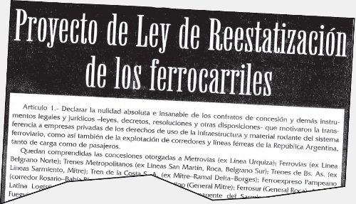 El proyecto elaborado por los ferroviarios plantea en su Artículo 1°: “Declarar la nulidad absoluta e insanable de los contratos de concesión… que motivaron la transferencia a empresas privadas de los derechos de uso de la infraestructura y material rodante del sistema ferroviario…”. En su Artículo 2do señala que dicha anulación se hará “sin indemnización alguna, procediendo los concesionarios a reintegrar todo… a valor actualizado…”. En el tercero, se dispone que “el Estado nacional reasume como único titular la propiedad, administración, explotación y funcionamiento de toda la Red Ferroviaria nacional… mediante un sistema Unico Ferroviario, el que operará bajo control de los trabajadores ferroviarios elegidos democráticamente, de todas las líneas férreas y con cargos revocables, y organizaciones de usuarios”. Se crea la empresa Ferrocarriles del Estado Argentino… “que diseñará un plan de recuperación, modernización y tecnificación del ferrocarril…” con el objetivo de rescatarlo y “ponerlo al servicio de las necesidades del pueblo trabajador, de las economías regionales, tornándolo eficiente, con taifas populares y accesibles, el que deberá integrarse a un Plan Nacional de Transporte controlado y puesto en funcionamiento por los trabajadores y organizaciones de usuarios de los distintos sectores comprometidos”. A su vez, el proyecto dispone la reincorporación de “todo el personal que haya sido cesanteado…”, creándose una comisión nacional investigadora con trabajadores ferroviarios que supervise el traspaso e investigue desde el 24 de marzo de 1976 hasta la fecha… “los distintos niveles de responsabilidad… de funcionarios, directivos, dirigentes políticos y gremiales que ocasionaron el actual colapso ferroviario”. Reynoso en NeuquénCharla debate: “¿Por qué hay que reestatizar los ferrocarriles?” Jueves 29, 20 horas, Aula 19 Facultad de Humanidades |