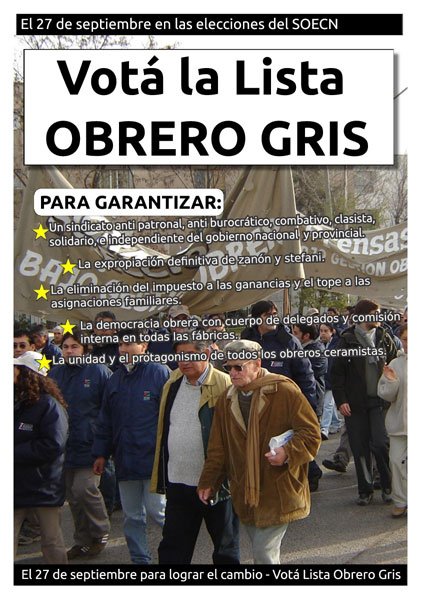 CeramistasImportante elección de la Lista Obrero GrisEl 27 de septiembre se realizaron las elecciones en el Sindicato Ceramista de Neuquén. Se presentaron dos listas, la Marrón, oficialista, y la Obrero Gris, lista alternativa que se presentaba por primera vez. En la fábrica Zanón esta nueva lista cosechó el 32% de los votos, es decir, uno de cada tres obreros. En el total del gremio, la Marrón consiguió 324 votos (71%) y la Obrero Gris 127 (29%).