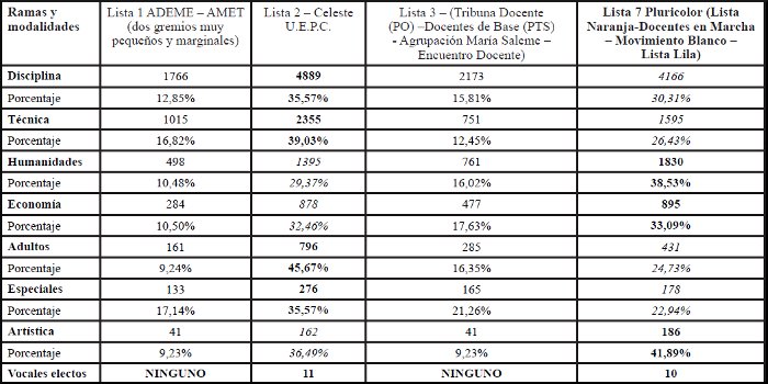 Docentes CórdobaResultados finales de las Elecciones para Junta de ClasificaciónEn pasadas ediciones de El Socialista se publicaron resultados parciales sobre la elección de Junta de Clasificación. Dado el lento y tortuoso proceso de recuento y revisión, recién ahora podemos publicar los resultados definitivos. Desde la burocracia Celeste se intentaba instalar “resultados” sin esperar al escrutinio definitivo, con el objetivo de quedarse con la mayoría (dos vocales) en la Junta de Economía y Gestión, y otorgarle el vocal por minoría de la Modalidad Especial a la lista 3, que en realidad pertenecía a la Lista 7 Pluricolor. Pero el escrutinio definitivo dejó en claro los resultados, que dieron un triunfo histórico a los sectores opositores agrupados en la Lista 7 - Pluricolor. Lo que sorprende es el balance de los compañeros de Tribuna Docente (PO) y Docentes de Base (PTS), que en distintos materiales siguen sosteniendo que la Pluricolor “retrocedió”, burda mentira con la que intentan ocultar el desastre de su política sectaria y resultados electorales en el ámbito provincial. No obtienen ningún vocal y sólo se impusieron en dos juntas en las elecciones en Capital. Es el precio de dividir a los docentes. Y la base docente se los hizo pagar. Por otra parte, y como parte del merecido festejo por este resultado, la “Pluri” realizó una importante peña con más de 300 compañeros en un importante local de Córdoba. De esta forma avanzamos en unidad contra la Celeste.