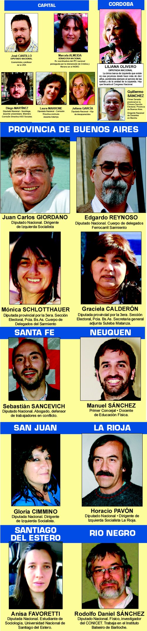 Como explicamos en otras páginas, el cierre de listas fue un verdadero zafarrancho. Al cambalache ya conocido de la suma de radicales, Pino Solanas, Carrió, Donda y Prat Gay, se le “sumó” el show de las listas peronistas, donde ya no se sabe quién es oficialista y quien opositor. Por eso es destacable la coherencia del impecable cierre de listas del Frente de Izquierda, en inmejorables condiciones para enfrentar tanto al gobierno como a todas las variantes de la oposición patronal. Dando un nuevo gesto de unidad para enfrentar las internas en las PASO y pelear por meter diputados de izquierda en octubre. Las luchas más importantes que han recorrido y recorren la Argentina en el último período estarán representadas en nuestras boletas. Así, en la Capital Federal, acompañando a Jorge Altamira, Andrea D’Atri y a nuestro compañero José Castillo, la lista de candidatos a diputados nacionales contarán con la presencia de los docentes combativos de Ademys, en la persona de Laura Marrone, miembro de su Comisión Directiva; de docentes universitarios, con Diego Martínez, de la Comisión Directiva de la AGDSociales; y de Juliana García, hija de desaparecidos y luchadora por los derechos humanos. A Senadores Nacionales, acompañará al delegado del subte Claudio Dellacarbonara, nuestra compañera Marcela Almeida, delegada de ATEIndec, ex directora del IPC nacional desplazada por llevar adelante las denuncias contra las estadísticas truchas, a quien ahora la intervención de Cristina y Guillermo Moreno junto al gobierno de Macri, no le pagan el sueldo desde hace meses a pesar que hubo un fallo favorable que los obliga incluso a reinstalarle en su puesto. En la Provincia de Buenos Aires, acompañando a Néstor Pitrola, Myriam Bregman y nuestro compañero Juan Carlos Giordano a diputado nacional, tendremos una destacada representación de trabajadores ferroviarios de la combativa Seccional Oeste de la Unión Ferroviaria y del cuerpo de delegados del Sarmiento. Edgardo Reynoso, uno de los máximos dirigentes junto al “Pollo” Sobrero en la lucha contra la burocracia de Pedraza y por la reestatización del ferrocarril bajo el control de trabajadores y usuarios va a diputada nacional; Mónica Schlotthauer, también del Cuerpo de Delegados del Sarmiento y defensora de los derechos de la mujer encabezando la pelea por el cupo femenino en el ferrocarril, va en la estratégica Tercera Sección Electoral acompañando a Christian Castillo. Y Juan Suppa (dirigente ferroviario de la Bordó Nacional en el ferrocarril Mitre), va a diputado nacional, entre otros ferroviarios. También hay una fuerte representación de docentes, entre ellos quienes vienen de ganarle 11 seccionales a la burocracia pro-kirchneristas de la lista Celeste de Baradel, como Graciela Calderón, electa Secretaria General Adjunta del Suteba Matanza, referente de la oposición docente de los SUTEBAS combativos y dirigente de la agrupación Docentes en Marcha, quien va en la Tercera Sección Electoral. Paula Alfaro (dirigente docente de Lomas de Zamora y de Docentes en Marcha), a diputada nacional, y Silvia Fernández (recientemente electa secretaria gremial en Suteba Tigre), también a diputada de la nación, entre otros compañeros maestros. En la 1° sección electoral encabeza nuestro dirigente nacional de Docentes en Marcha Guillermo Sánchez. También formará parte de la lista Nelsa Bou Abdo, delegado telefónica, referente de la oposición en el gremio e integrante de la lista Granate-Blanca en las próximas elecciones FOETRA Buenos Aires, entre otros luchadores. En Córdoba, la lista está encabezada por nuestra compañera y actual diputada provincial, Liliana Olivero, que ahora va a diputada nacional. Liliana lleva más de una década poniendo su banca al servicio de todas las luchas obreras y populares. Lleva presentados decenas de proyectos que propone llevar al congreso nacional si es electa, como la rebaja de las dietas de los diputados a lo que cobra una maestra de grado con diez años de antigüedad; la expulsión de la multinacional Monsanto de Córdoba y de todo el país; y la defensa del agua como recurso humano esencial, entre tantos otros. Y así, en cada lugar del país. Los candidatos del FIT son trabajadores, luchadores, estudiantes, profesionales, referentes en los reclamos barriales o de la megaminería, que forman parte o se han hecho presentes apoyando las luchas. Vos los conocés. Estamos junto a vos en los lugares de trabajo, estudio y barrios. Lo contrario de los candidatos patronales, visiblemente ausentes en los reclamos populares, cuando no directamente en la vereda de enfrente. El Frente de Izquierda va a dar batalla por llegar al Congreso Nacional, a las legislaturas provinciales y a los concejos deliberantes con estos compañeros. Meter diputados de izquierda será el gran desafío. De lograrlo, nos permitirá estar más fuertes para ganar cada una de las luchas y también para dar a conocer nuestro programa alternativo al servicio de la clase trabajadora y el pueblo. Para hacer fuerte de la mano de la unidad de la izquierda una nueva alternativa política al servicio de las demandas populares y las transformaciones de fondo que necesita nuestro país. Te invitamos a acercarte al Frente de Izquierda. A que nos ayudes a hacer conocer nuestras propuestas y a sumarte a la pelea para que estos compañeros lleguen al Congreso. Las “internas abiertas” (PASO): Una trampa proscriptivaEl gobierno kirchnerista se caracteriza por ocultar los verdaderos objetivos de sus medidas antipopulares y antidemocráticas con frases y campañas demagógicas y rimbombantes con las que intenta que parezcan lo opuesto. Esto ocurrió en 2009 cuando logró imponer, con la complicidad de los principales partidos patronales, la UCR y el PJ, la ley de Reforma Política. En sus discursos decía que su intención era “transparentar la política” y “terminar con las listas fantasmas y colectoras”. Así n