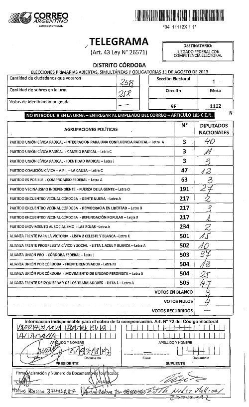 El Congreso ya está lleno de peronistas, desde su vertiente progre a su vertiente feudal. Es la oportunidad de meter a uno de izquierda. Los del FIT no buscan una banca para enriquecerse personalmente sino para sostener luchas de siempre. ¿Cuántos pueden decir lo mismo?" Santiago: FPV vs. FIT“Los resultados fueron letales para el FPV local, y replanteó el escenario para octubre. ´No tiene sentido ir a octubre. ¿Para qué? ¿Para qué nos gane la izquierda?´, reflexionaba y se preguntaba un alto dirigente del Frente Para la Victoria.” (La Nación, 13/08). Es que el FPV de Santiago sacó casi el 8% de los votos, y el FIT el 4 por ciento. “Primeros” en Córdoba