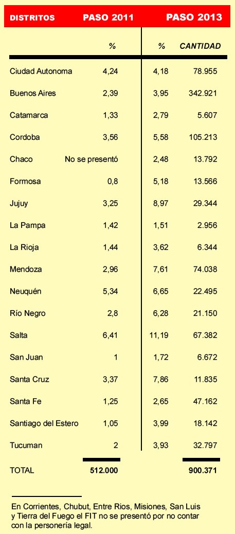 El FIT obtuvo 900 mil votos¡Ahora vamos por diputados de izquierda!Con 900 mil votos en todo el país y superando el piso proscriptivo de las internas en los 19 distritos en que se presentó, el Frente de Izquierda se proyectó como cuarta fuerza nacional. El FIT superó en un 80% lo obtenido en las primarias de 2011. Un salto cualitativo y nacional. Esta gran elección dejó a un paso la posibilidad de meter diputados y legisladores de izquierda en octubre. Por ese desafío vamos ahora. Saludando a quienes nos votaron y posibilitaron este gran avance, y al enorme esfuerzo que puso la militancia del Frente.