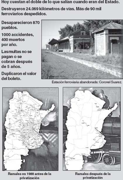Hoy día Carlos Menem es uno de los personajes más odiados del país. No lo defiende ni siquiera su señora. Y viene creciendo el reclamo popular contra las privatizaciones. Nos preguntamos: ¿qué hicieron los presidentes que le sucedieron? ¿Para beneficiar a los usuarios y a los trabajadores? Nada. Estamos cada vez peor y los empresarios privatizadores, cada vez mejor. De la Rúa les prorrogó el negocio Ya nadie se acuerda del Secretario de Transporte que tuvo la Alianza. Era Jorge Kogan, que tenía mucha experiencia: dirigió el área bajo la dictadura de Videla y también fue funcionario de Menem, dedicándose a la privatización de trenes y subtes. En diciembre de 2000 metió un tarifazo en colectivos, trenes y subtes. Poco después, el presidente De la Rúa, asesorado por Kogan, prorrogó las concesiones. TBA obtuvo 22 años más y la continuidad del subsidio -además del tarifazo de Navidad-. Duhalde les dió la «Emergencia Ferroviaria A comienzos del 2003 el deterioro de los servicios ya era tan escandaloso que el gobierno tuvo que ordenar auditorias por las irregularidades y los «numerosos incumplimientos», como dijo el informe de la CNRT (Comisión Nacional del Transporte). ¿Qué pasó? Las multas no se pagaron, los incumplimientos no se cumplieron. Pero los concesionarios, gracias al decreto 2075 de Duhalde, que declaró la «Emergencia Ferroviaria», recibieron nuevos subsidios y el compromiso del Estado de pagar obras e inversiones que deberían hacer los privatizadores. Un botón de muestra de las obligaciones asumidas por la patronal TBA: quedó comprometida a reparar tres máquinas diesel en... ¡tres años! ¿Y Kirchner? En su campaña electoral del 2003 Kirchner hasta pronunció alguna vez la palabra «reestatización». Comenzaba a poner en práctica su doble discurso. Para la patronal, el negocio siguió. Entre bombos y platillos, el gobierno montó algunos «trenes de cartón», como el Gran Capitán que viajó a Misiones, el Estrella del Norte a Tucumán y el tren a Córdoba. El sistema ferroviario siguió empeorando, mientras se fueron incrementando cada vez más los subsidios. En relación a la cantidad de kilómetros que cubre el servicio y la cantidad de trabajadores que emplea, el Estado está poniendo mucha más plata que cuando eran estatales y todo va a los bolsillos de los empresarios. Veamos un ejemplo. Luego de los incidentes ocurridos en la estación Haedo de TBA el 1/11/05, el gobierno de Kirchner incrementó en un 32% los subsidios a los concesionarios de trenes con relación al 2004. En total han recibido $ 694 millones. Este año se plantea la batalla por la anulación de los contratos ya que después de varias postergaciones los mismos vencen. |