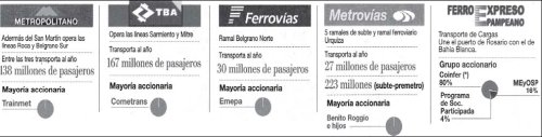 De cargas: Belgrano Cargas (Unión Ferroviaria, Sec. Gral. Pedraza, Grupo Macri); Buenos Aires al Pacífico (BAP)-San Martín-Ferrocarril Urquiza Mesopotámico (Grupo brasilero ALL); Nuevo Central Argentino-Carga del Mitre (Aceitera General Deheza, Banco Francés y Grupo brasilero ALL); Ferrosur (Grupo brasilero); Unidad Ejecutora (en manos del gobierno de la Provincia de Buenos Aires); Ferroexpreso Pampeano (Techint). (*) TBA no descarta tener su propia aerolínea utilizando Southern Winds.La Nación 4/1/06. |